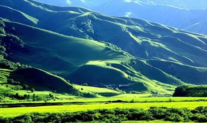 这一片悬挂在天际的草原,仿佛故意不让人一眼看透,因此并不一望无际,而是如大海般掀起碧波巨浪,让人在高低起伏中看到不同的美,而其中一排排绿树则如一面面屏风,将这片草原分割成小块,让人不得不缓步慢行,细细品味。