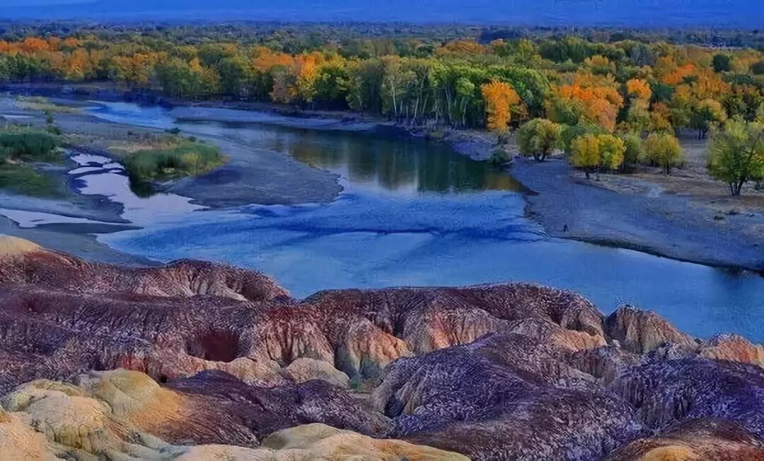 位于新疆布尔津县城西北24公里处的额尔齐斯河北岸,是一个以雅丹地貌著称的河滩。地下侏罗纪时代的煤层,经过千万年风蚀雨剥以及河水的冲刷,在几乎寸草不生的河滩上出现了红、绿、紫、黄、棕等鲜艳的色彩。
