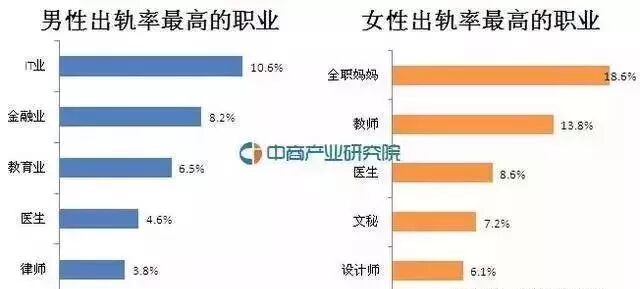 数据来源:中国产业信息 而从出轨率最高职业统计中显示, 男性出轨率最高的职业是IT业, 女性出轨率最高的职业是全职妈妈。