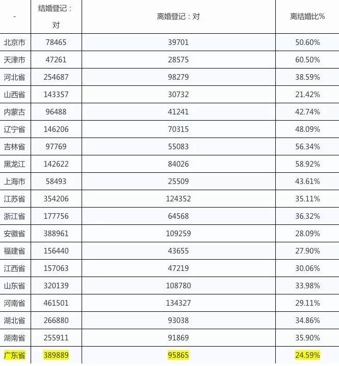 近日,有权威机构发布大数据: 广东的离婚率已经高达24.59% ▼