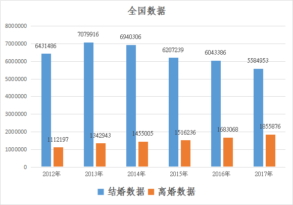 以上数据来源于:公开资料整理 从2012年-2017年, 全国上半年婚姻人口数据趋势来看, 结婚的人数每年都在下降, 离婚率却在上升。