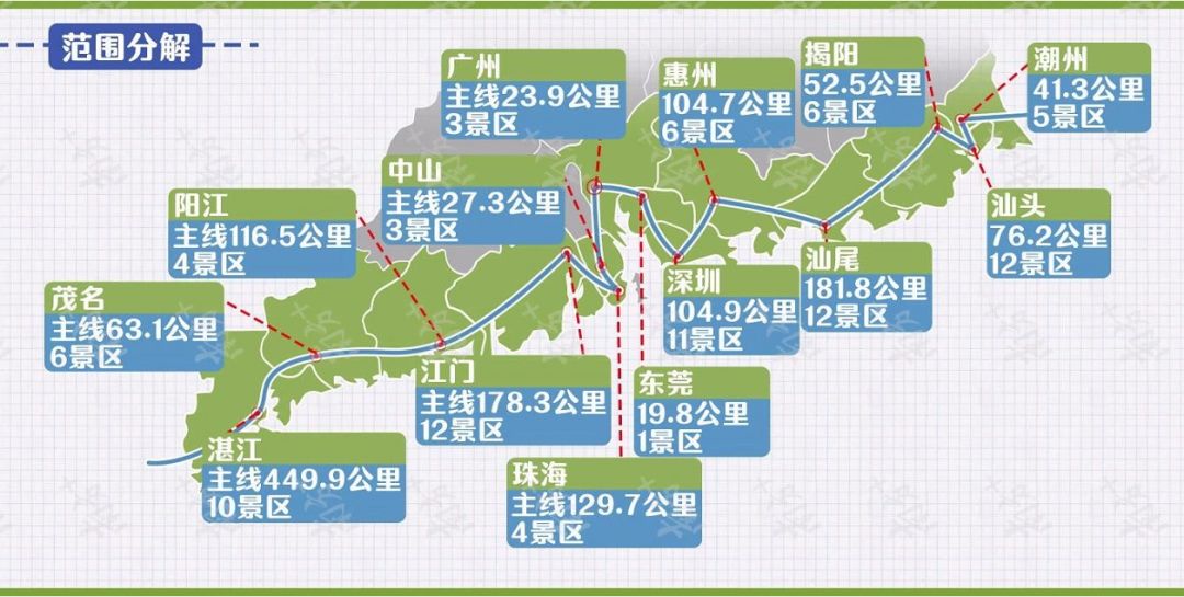 提示:点击上方"潮商"关注我们 据广东交通运输厅发布的《广东滨海旅游公路规划》,广东滨海旅游公路将在2020年全面启动建设。汕头将作为全省示范工程,先行启动建设! 全球最长的滨海公路! 据了解,广东滨海旅游公路全程约1875公里,建成将是全球最长的滨海旅游公路。 该公路途径潮州、汕头、揭阳、汕尾、惠州、深圳、东莞、广州、中山、珠海、江门、阳江、茂名、湛江等14个滨海城市,将连接38个县(区)、164个乡镇(街道),辐射15个产业园区、20个滨海新区和90个旅游景区,主线全长约1570公里。 此外,滨海旅游公路设连接重要沿海海岛(半岛)并纳入省道规划的支线约305公里。 ![]() 广东滨海旅游公路立足“交通+旅游”融合发展理念,坚决保护沿线自然生态,通过纵横向特色化设计,顺应滨海地区自然肌理,充分利用水系、防护林、海堤等开放空间边缘和现有道路系统,坚持快速通道与慢行系统有机结合,总体由车行系统、慢行系统、滨海风貌带、配套服务设施等4部分组成。
