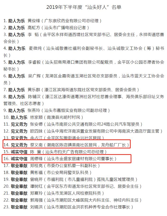提示:点击上方"潮商"关注我们 关于获得2019年下半年度“汕头好人”荣誉称号的通报 为培育和践行社会主义核心价值观,积极培树好人文化,在全社会大力倡导“崇尚好人、争做好人”的良好氛围,推动汕头市创建全国文明城市工作,根据中央、省文明办的有关部署,市委宣传部、市文明办组织开展了“汕头好人”评选活动。经各地各部门推荐、公众投票、组织约谈以及评委评审,决定授予黄俊锋等23位同志2019年下半年度“汕头好人”荣誉称号。 希望获得荣誉称号的同志珍惜荣誉,再接再厉,继续在社会风尚引领、公民道德建设中发挥更大作用,取得更大成绩。各地各部门要大力宣传“汕头好人”的感人事迹和高尚品德,充分发挥典型示范带动作用,弘扬道德新风,推动全国文明城市创建工作深入持续开展。 附件:2019年下半年度“汕头好人”名单 ![]()