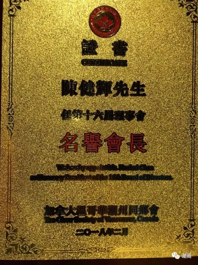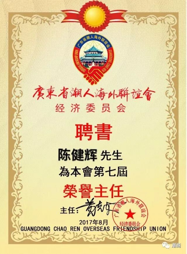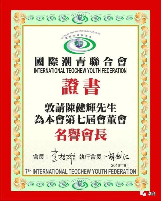 提示:点击上方"潮商"关注我们 帅气的光头、魁梧的身材、憨厚真诚的笑容,人群中你总能一眼认出他,比他年长的人称呼他为“吖腊”,比他年少的则称呼他为“腊哥”。他,就是深圳市汕头商会常务副会长陈健辉。 美国华人社团大联盟荣誉主席、美国东方文化联谊会荣誉会长、第六届潮商大会名誉主席、第八届国际潮青会名誉主席、深圳市潮汕商会名誉会长、深圳市潮汕青年商会名誉会长和深圳市汕头商会常务副会长......身兼多职,陈健辉堪称是潮商界的“大牛”,但亲和力偏偏是他最好的名片。 << 滑动查看下一张图片 >> 荣誉证书 -CERTIFICATE OF HONOR- 佛山市潮汕商会 名誉会长 加拿大温哥华潮州同乡会 名誉会长 英国潮汕联谊会 名誉会长 广东省潮汕企业商会 名誉会长 汕头海外联谊会第八届理事会 名誉会长 深圳市普宁商会 名誉会长 美国东方文化联谊会 名誉会长 第六届潮商大会 名誉会长 深圳市潮汕青年商会 名誉会长 第九届国际潮青联谊年会 名誉主席 国际潮青联谊会第七届会董会 名誉会长 美国华人社团大联盟 荣誉主席 深圳市汕头商会第二届 常务副会长 汕头市侨商投资企业协会 名誉会长 广东省潮人海外联谊会经济委员会 荣誉主任 深圳市潮青创业促进会 名誉主席 深圳市潮汕商会 名誉会长 阿联酋潮汕总商会 名誉会长 深圳市潮汕商会工贸物流协会 名誉会长 巴西(南美)潮汕总商会 名誉会长 汕头市侨联第十八届委员会 名誉主席 深圳第七次潮商大会 名誉主席 中华国礼文化艺术研究会 名誉会长 深圳市巾帼潮商商会 名誉主席 陈健辉的家乡在汕头潮南区成田溪东村,他的父亲陈焕荣是当年首批到深圳特区创业的潮汕人,而他的曾祖父则是清末民初的著名潮商陈玉亭。 潮南区成田溪东村 陈玉亭 清末民初,上海是万商云集、进出口贸易频繁的国际大商埠,以其特殊的经济地位而逐渐发展成为中国乃至远东地区的金融中心。而汕头的开埠与近代轮船业的兴盛,为近代潮汕商人走出潮汕提供了便利的交通条件,潮人走出乡土家园,散居于大陆沿海乃至内陆沿江的口岸地区,上海就是近代潮商的集结之地。 近代上海潮商除了从事海贩,发展上海与潮汕地区商业贸易外,还有一部分近代早期潮商伴随着西方列强势力进入上海,以鸦片贸易发家。后来,随着鸦片贸易逐渐消亡,上海的潮籍鸦片商人转而投资金融业与纺织业,有很多人成为了上海滩有名的大资本家。 上海潮州会馆所在地 到了20世纪初,上海潮商开设了鸿裕纱厂、鸿章织染厂等,郑培之、郭子彬等人成为上海早期纺织界的巨头,而在上海钱庄业,潮商也在占有一席之地。近代上海潮商经济实力雄厚,特别是在纺织业与钱庄业中拥有相当的实力,随着近代上海经济的发展,上海潮商经营范围不断扩大,遍及潮糖、土产、房地产、钱庄、纺织业、面粉业、百货、饮食等,在这些上海商界的重量级人物之中,陈玉亭便是这其中的佼佼者之一。 民国初期,上海帮会林立,有江苏帮、浙江帮、潮州帮、绍兴帮、宁波帮等。广东财界在上海也有一定的地位,他们能在上海与江浙帮争雄,其中潮州帮起着重要的作用,尤以铜盂郭(郭子彬、郭乐轩为代表)、沙陇郑、成田溪东陈(陈青峰、陈玉亭)为代表形成了上海潮州帮的三大经济体系。 在凭借土行买卖积累了原始资本后,陈玉亭开始涉足金融业和纺织业,其家族也在汕头市区小公园一带购买了大量房产物业,投资涉足了各大行业,成为潮汕富豪,家族财丁兴旺。 汕头小公园 目前,陈玉亭的后人遍布世界各地,多为成功人士,事业有成,“猎哥”陈健辉正是陈玉亭的曾孙。 仁者为善,兼济天下是潮商精神的表征,潮商为善,代代相传。陈玉亭发家之后经常救济桑梓父老乡亲,传为美谈。而陈健辉的身影常常出现在公益活动的现场。他虔诚信佛,怀着一颗善心,这是乐施善行的原驱动力。 陈健辉与中国佛教协会副会长、 普陀山佛协会长道慈大和尚交谈, 组织捐赠善款1775000元,捐建普陀山观音菩萨像。 2017年5月,陈健辉率领潮商礼佛团一行60多人赴韶关南华寺礼佛祈福。在他的募集下,来自海内外十多个潮属社团的会长、副会长等共50多位潮商捐赠礼佛善款,共计120万元,全额捐赠至南华寺。 陈健辉受泰国前总理特使刘辉委托, 向传正大和尚赠送纪念品 2017年8月8日,四川阿坝州九寨沟县发生7.0级大地震,陈健辉在自己的朋友圈、微信群发起捐款接龙,得到热烈响应,仅半天就募集捐款十多万元,并第一时间送到了深圳市慈善会。 陈健辉将捐款支票交到深圳市慈善会 执行副会长、秘书长房涛手中 今年3月,陈健辉率潮商礼佛团一行70余人赴广州光孝寺礼佛祈福,共募集善款1748888元,通过认知和感悟佛法来弘扬中华民族传统文化,同时也为中泰友好交流提供了平台。 陈健辉与中国佛教协会副会长、 广东省佛教协会会长明生大和尚合影 热心公益事业,积极参与潮商会务建设也让陈建辉结交了来自海内外的志同道合的好友,看人长处、帮人难处、记人好处的陈健辉朋友遍天下! 2016年11月15日,陈健辉随同深圳市汕头商会、深圳市侨商智库偕深圳企业家考察团出访南亚四国,图为泰国原总理英拉(左)为陈健辉合影 陈健辉和加拿大政府部长黄陈小萍(左二)、香港中国商会会长陈经纬先生(右二)合影 陈健辉与国际潮青会长李桂雄和香港潮属社团总会长、 国际潮青执行会长胡剑江会