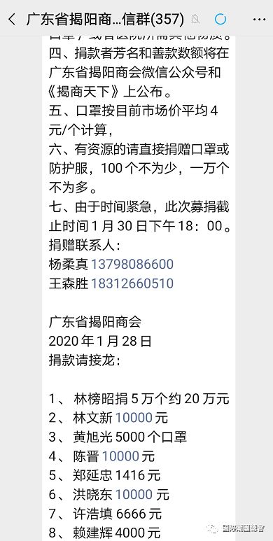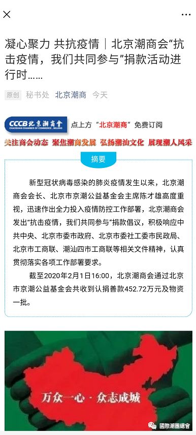 05 北京潮人海外联谊会/美国潮商总会 北京潮人海外聯誼會/美國潮商總會共同發佈“眾志成城、防控新型冠狀病毒疫情”專項募捐倡議書,共同為防控疫情作出貢獻。 捐款接龍捐款接龙 ![]() ![]() 06 北京潮商会 北京潮商会发出“抗击疫情,我们共同参与”捐款倡议,截至2月1日,共收到认捐善款452.72万元。
