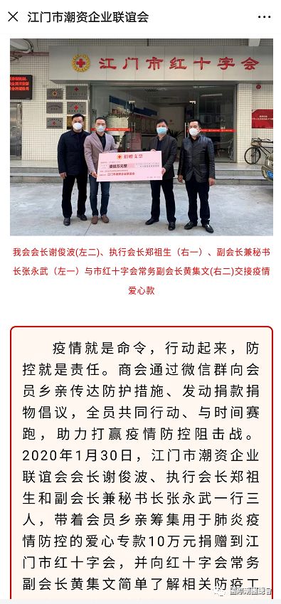 12 江门市潮资企业联谊会 江门市潮资企业联谊会向会员乡亲传达防护措施,发动捐款捐物倡议,截至1月30日筹得爱心专款10万元捐赠给江门市红十字会。