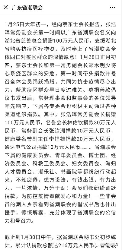 注:以下会员单位及团体个人捐赠信息排序不分先后 01 广东省潮人海外联谊会 广东省潮人海外联谊会及时号召会员,积极行动组织捐款,截止1月30日中午,累计认捐总额达216万元人民币。