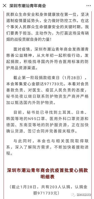 11 深圳市潮汕青年商会 深圳市潮汕青年商会发扬潮青慈善公益精神,从大年初一积极行动,积极找寻国内外防护用品资源渠道,截止1月28日共认捐善款971733元。