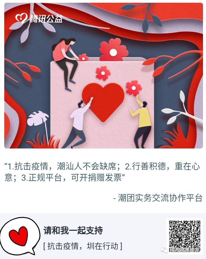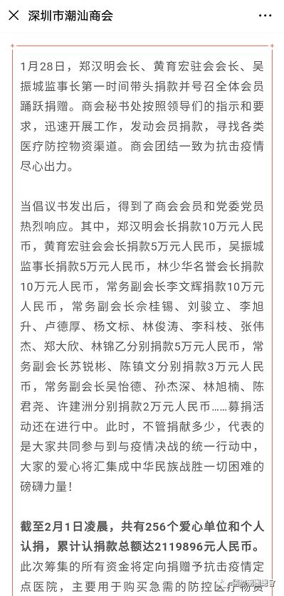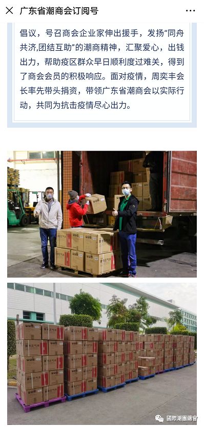 我们相信,还有很多很多的无名英雄在这背后,默默的贡献。 扶危济困、为善不甘人后,是潮汕人的优良传统。疫情发展势头还未减弱,目前湖北武汉等疫区及一些城市依然面临防疫物资紧缺问题,让我们海内外潮人共同行动起来,积极参与抗击新型冠状病毒感染肺炎疫情,一起打赢这场看不见硝烟的战争! 来源:国际潮团总会 声明:本文不代表我们的观点,仅供读者参考。文章版权归原作者所有,如有侵权,请联系我们进行删除。 潮 商 文化的境界 · 财富的智慧