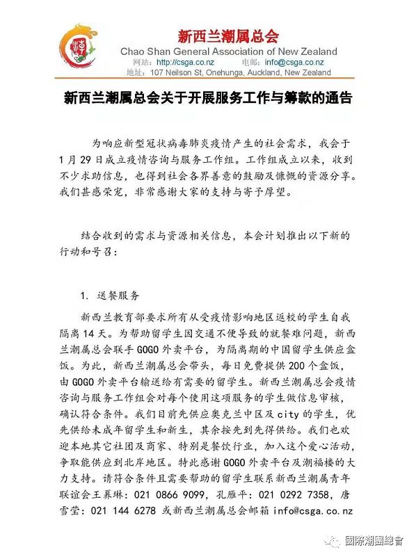 07 新西兰潮属总会 新西兰潮属总会于1月29日成立疫情咨询与服务工作组,帮助留学生因交通不便提供送餐服务和发起筹款活动。