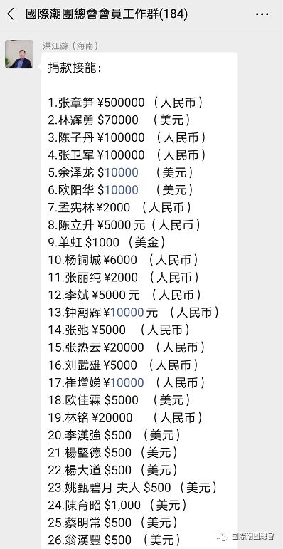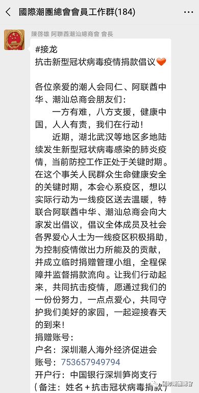 当前,势头不减的新型冠状病毒肺炎疫情 进入关键时期 国际潮团总会主席洪江游 国际潮团总会执行主席陈幼南 高度关注事件 责成常设秘书处向全球发出倡议 号召各会员单位和全球潮团 共行动 齐战疫 短短几天 各地潮团迅速行动,积极响应国际潮团总会的号召 各地潮团首领带头捐款,工作群组接龙又接龙