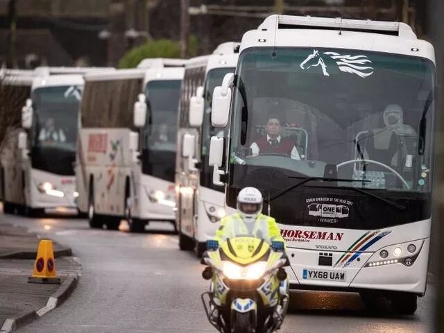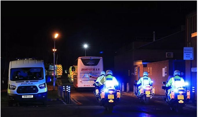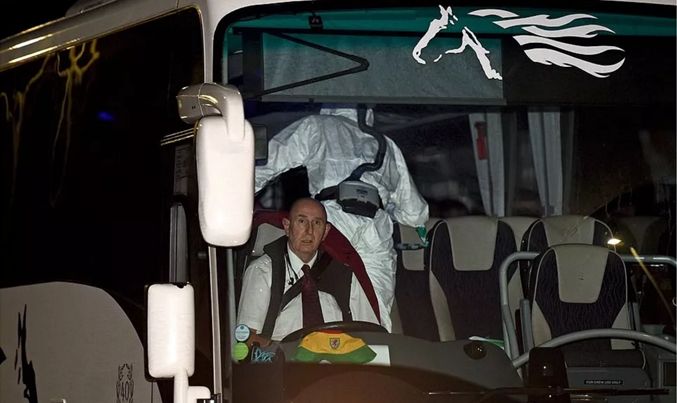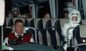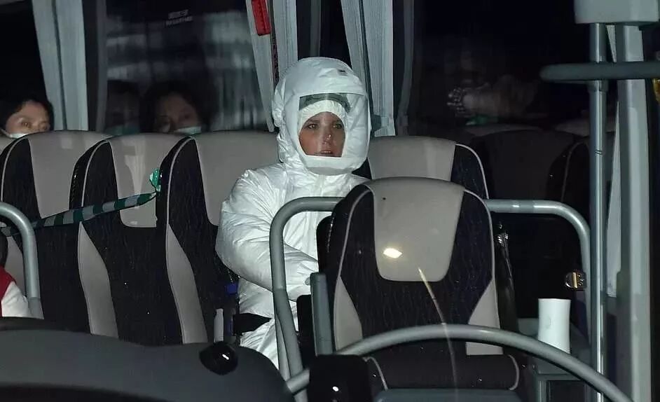 飞机抵达空军基地后,布莱兹诺顿整个村所有路都暂时封锁。这些英国人从飞机上下来后,坐进早早等候在附近的7辆大巴车。每辆大巴车上都配有一名身穿防化服的医护人员。