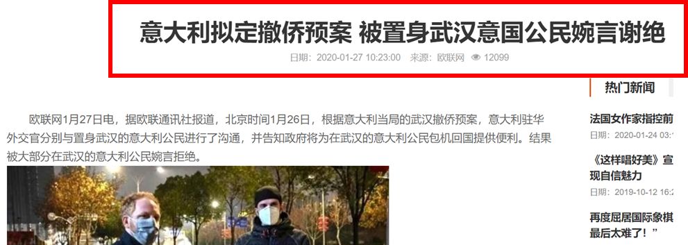 意大利政府也想撤侨,他们的外交部把最初的撤侨行动预案和武汉当地的意大利公民沟通过后, 结果,万万没想到, 意大利公民都拒绝了,觉得意大利政府的撤侨方案太疯狂太危险了。。。