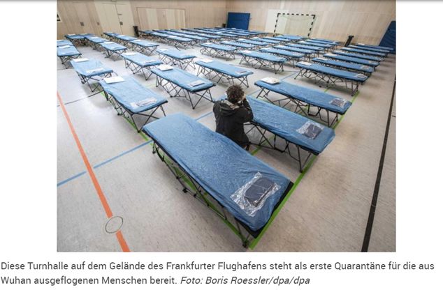 在法兰克福机场旁,封闭了一座体育馆,在体育馆内设置了许多行军床和医疗设备。返回的侨民会先在这个体育馆内停留,接受身体检查。通过检查的人员会被送到军方基地隔离14天。