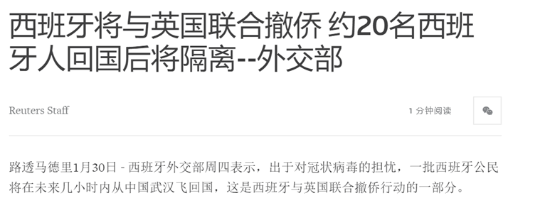 西班牙在武汉的公民不多,所以他们决定和别的国家拼飞机。 20多个西班牙人和刚才那83个英国人一同在英国的撤侨行动中回到了欧洲。