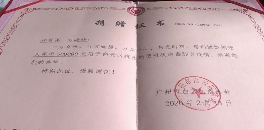 今年1月份,郑晋谋向妻子方晓玲求婚成功,原计划年后举办婚礼。随着疫情形势加急,各地启动突发公共卫生事件一级应急响应,严禁举办聚集性活动,这样一来,婚礼只能延期。持续关注着疫情发展的小夫妇萌生了一个想法,反正酒席办不了,不如把50万元的预算捐给抗疫一线的人,这样更有纪念意义。50万元不是一笔小数目,郑晋谋希望寻求一个可靠的渠道捐赠。正巧,他在和姑姑杨妙英的聊天中了解到,姑姑通过区工商联的渠道与区慈善会取得联系,向广州、深圳等地的医院捐赠了大量物资。通过姑姑的介绍,他决定将50万元捐给区慈善会,帮助抗疫一线人员解决所需。