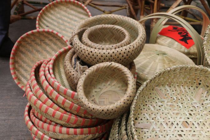 除竹篮之外,潮汕的竹器多得无法计算:竹笠、竹筛(筛斗筛米志,米筛筛糠)、簸箕、箩筐、筐头、囊椅(炊用)、笼甑、笼甑盖、盖炊(像竹笠尖)、篾盘、竹椅,还有农家的畚箕、戽斗、秧夹、鸡笼、鹅围、谷笪……一家人的竹器,至少有几十件。