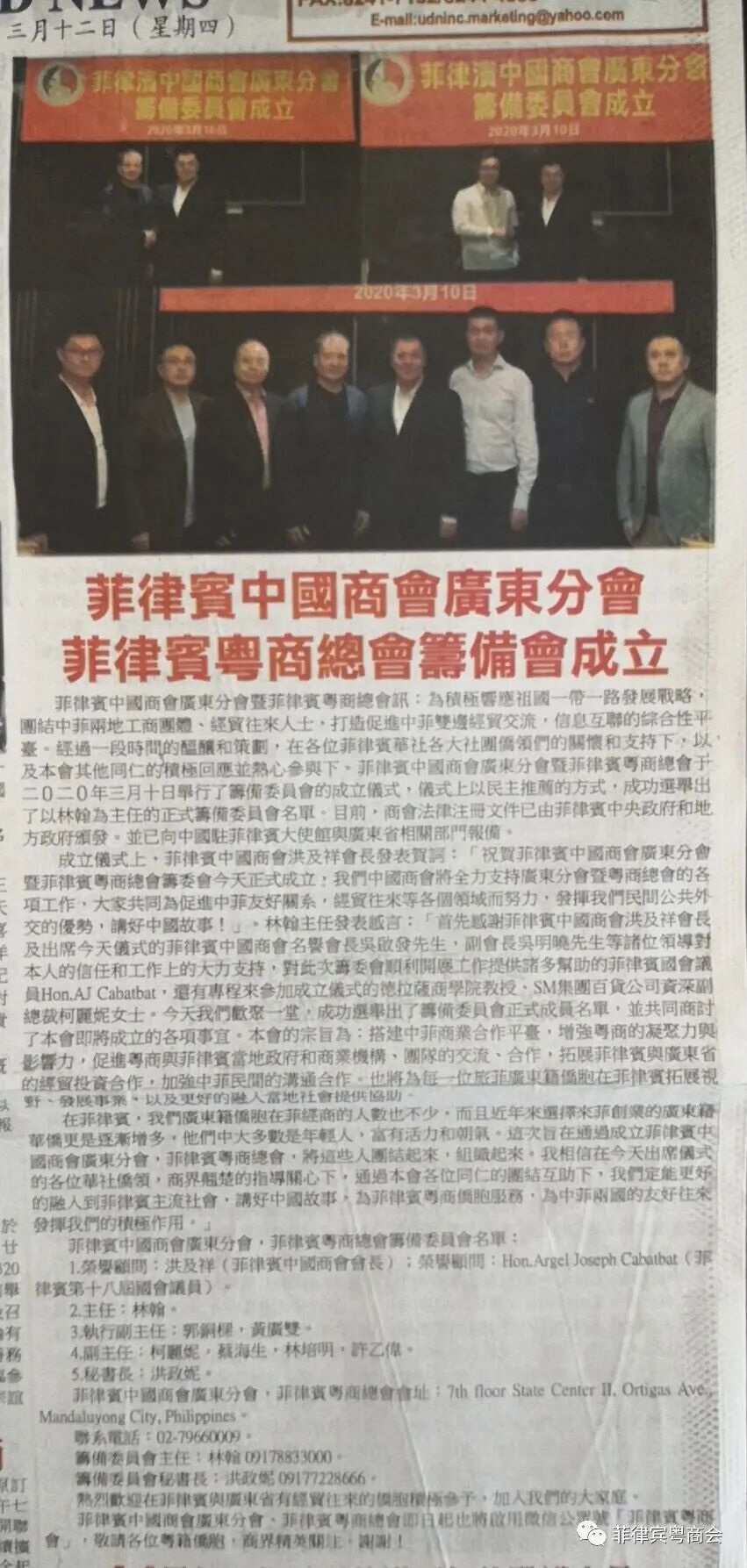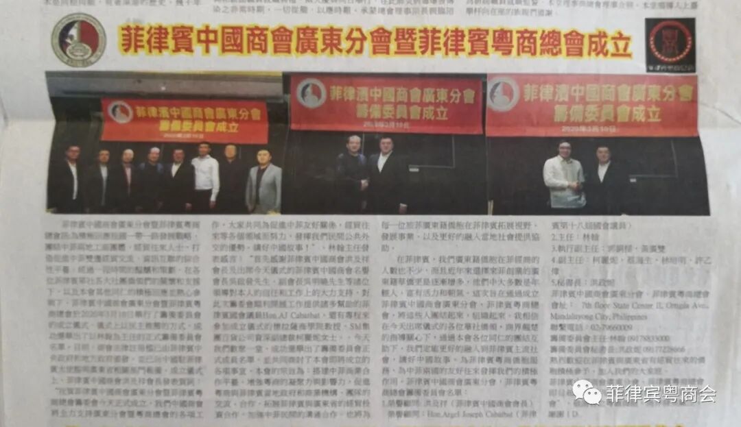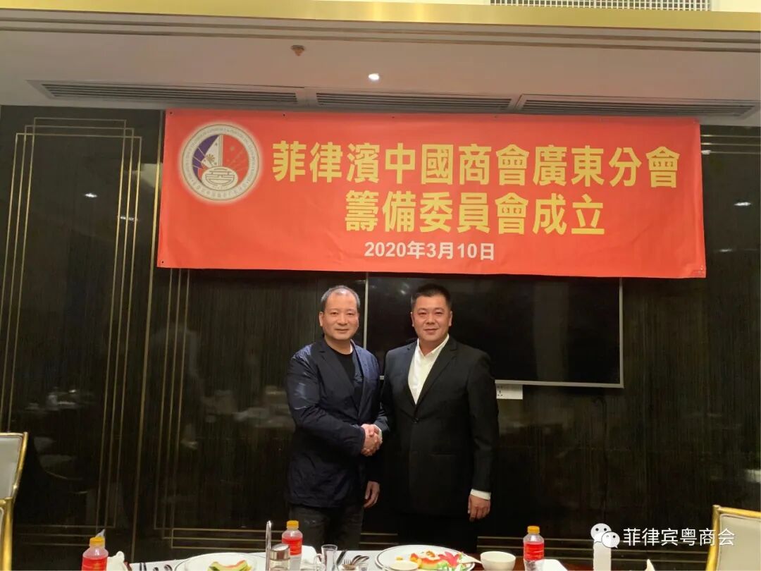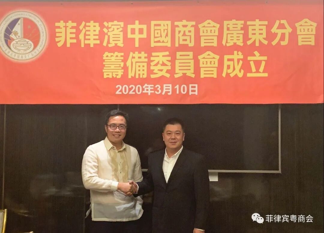 成立仪式上,菲律宾中国商会洪及祥会长发表贺词:“祝贺菲律宾中国商会广东分会暨菲律宾粤商总会筹委会今天正式成立,我们中国商会将全力支持广东分会暨粤商总会的各项工作,大家共同为促进中菲友好关系,经贸往来等各个领域而努力,发挥我们民间公共外交的优势,讲好中国故事!”。林翰主任发表感言:“首先感谢菲律宾中国商会洪及祥会长及出席今天仪式的菲律宾中国商会名誉会长吴启发先生,副会长吴明晓先生等诸位领导对本人的信任和工作上的大力支持,对此次筹委会顺利开展工作提供诸多帮助的菲律宾国会议员Hon.AJ Cabatbat,还有专程来参加成立仪式的德拉萨商学院教授、SM集团百货公司资深副总裁柯丽妮女士。今天我们欢聚一堂,成功选举出了筹备委员会正式成员名单,并共同商讨了本会即将成立的各项事宜。本会的宗旨为:搭建中菲商业合作平台,增强粤商的凝聚力与影响力,促进粤商与菲律宾当地政府和商业机构、团队的交流、合作,拓展菲律宾与广东省的经贸投资合作,加强中菲民间的沟通合作。也将为每一位旅菲广东籍侨胞在菲律宾拓展视野、发展事业、以及更好的融入当地社会提供协助。菲律宾国会议员Hon.Argel Joseph Cabatbat与筹委会林翰主任在菲律宾,我们广东籍侨胞在菲经商的人数也不少,而且近年来选择来菲创业的广东籍华侨更是逐渐增多,他们中大多数是年轻人,富有活力和朝气。这次旨在通过成立菲律宾中国商会广东分会,菲律宾粤商总会,将这些人团结起来,组织起来。我相信在今天出席仪式的各位华社侨领,商界翘楚的指导关心下,通过本会各位同仁的团结互助下,我们定能更好的融入到菲律宾主流社会,讲好中国故事,为菲律宾粤商侨胞服务,为中菲两国的友好往来发挥我们的积极作用。”菲律宾中国商会广东分会,菲律宾粤商总会筹备委员会名单:
