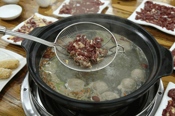 牛肉火锅 Chaoshan beef hotpot 潮汕牛肉火锅店对牛的各个部分进行分类,不同的部分价位也有差别,而且对于涮的时间也要求不一样。潮汕人吃火锅蘸料最简单的一般配上沙茶酱,也会有很多自制酱料。