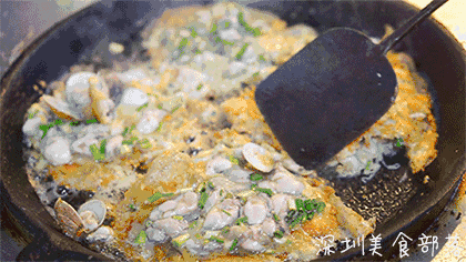 蚝烙 Oyster omelette with tapioca starch 在潮汕城市乡村小市集,常有这种小店或摆摊小贩。这种蚝烙,是用地瓜粉溶于水,拌葱珠,在一个平底的铁锅上煎,加上海蛎,再下蛋花,取起蘸鱼露吃。