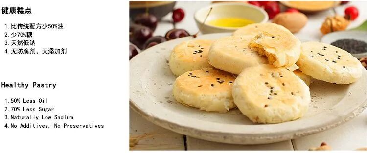 绿豆饼 Mung Bean Pastry 绿豆饼是选择优质面粉深加工后,配备营养丰富的绿豆馅,并运用专用的配 料,加工而成,其松、香、酥、软、香醇诱人、细腻香软,是市场火爆的特色传 统糕点小吃。