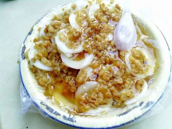 咸水粿 Chwee Kueh 流传至今已有几百年的历史,形状小巧,貌似小碗碟,中间盛着加了少许辣 椒酱的潮州特产菜脯粒,色泽洁白如豆腐,口感滑润柔软,突出菜脯的咸芳味。小编偶尔回去,总会找一餐只吃咸水粿,吃到饱为止。