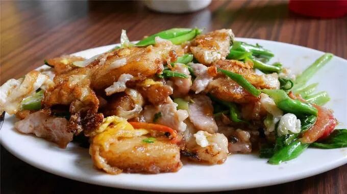 菜头粿 Fried White Radish Patty 即萝卜糕,菜头粿原料很多,有芹菜、蒜花、花生仁、 胡椒粉等,当然还有必不可少的萝卜。吃菜头粿时要先切成小块,用油煎成金黄色,吃起来外皮酥脆,内里柔软香甜。小编喜欢蘸点辣椒酱吃,真是白吃不厌。