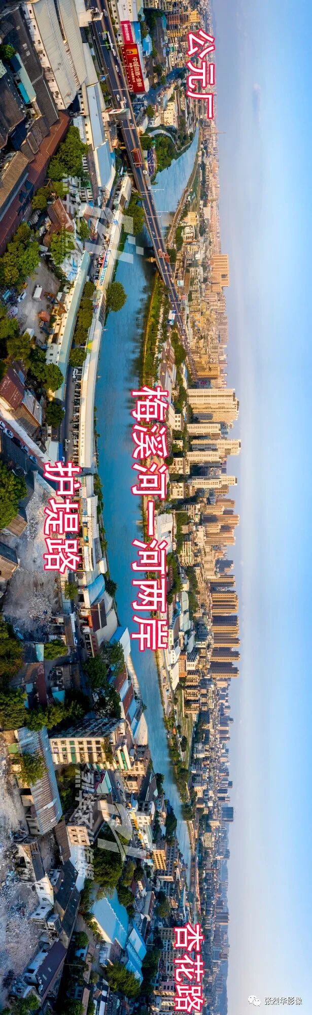 护堤路沿着梅溪河至南向北延伸,一河两岸是美景。