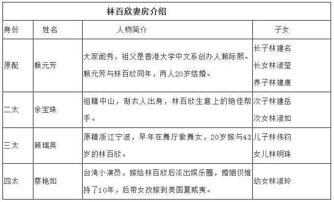 余宝珠(前)与谢玲玲(右三)及儿女们 “永不言休”诚可贵,若是未做好传承计划,也会留下空叹、遗憾!林百欣死后,家族成员却上演一幕争产大剧,其背后究竟陷入了什么传承困局呢? 林百欣于2005年2月18日,因肺炎而引起多项併发症:胆管发炎、肺部感染、肾功能衰竭、肠脏感染等而病逝,卒年90岁。 林百欣一生讨了四房太太,分别是原配发妻赖元芳、二房太太余宝珠、三房顾瑞英,还有四太太蔡艳如。四太蔡艳如,即鸿海郭台铭的岳母,其发妻林淑玲的母亲。林百欣打理台湾生意时,与台湾的一个小演员蔡艳如结识,两人关系仅维持10年,后来,蔡艳如带着幼女林淑玲改嫁到了美国夏威夷。(注:举办林百欣丧礼时,只提及其前三房家属) 据香港媒体报道,林百欣对前三位太太有一套“驭妻术”, 对老婆与其子女讲“公平”:即一星期7天中,周一至周六轮流陪三位太太,星期天则是分早、午、晚三餐平均分配,不偏心。