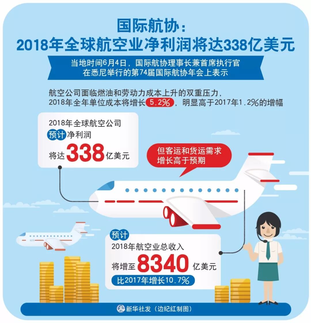国际航空运输协会表示,尽管面临成本上涨压力,2018年全球航空公司盈利稳定,预计净利润将达338亿美元。