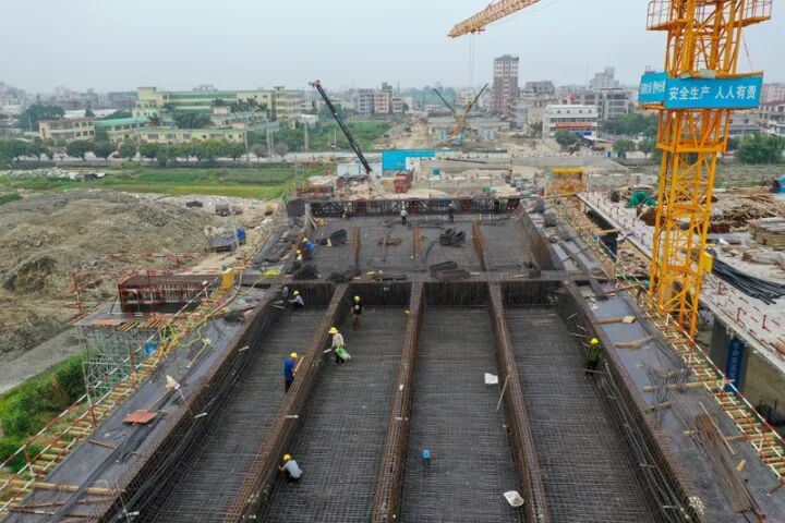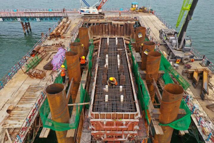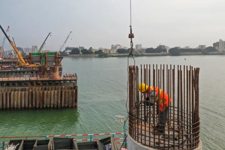21日下午,在新津河特大桥主墩施工现场,一台大型吊机来回将一捆捆钢筋吊到水中的作业平台上,工人们正在31#主墩绑扎钢筋。据中建五局汕北大道龙湖段项目部三分部副经理侯圣慧介绍,主桥31#主墩已完成承台施工,正抓紧加台的作业,在浇筑混凝土后,下一步将把主墩四周的钢板桩拔除,恢复河道原状,预计6月上旬就可以完成31#主墩的下部结构施工。主桥的32#主墩正在进行倒U型墩的施工,在下月初完成下部结构后,将正式进入上部结构的施工阶段。项目另一控制性工程外砂河特大桥桩基施工已完成90%,其中水中桩100%完成,开始进行挂篮现浇连续梁施工。 预计到今年年底,汕北大道龙湖段1.2公里长的东兴路高架桥将全线建成;外砂河特大桥实现合龙,主体工程基本完工。全线路基段施工到今年年底也将全部结束,沥青路面铺筑工作在10月份提前分段实施,为明年亚青会前项目全线建成通车赢得更加充足的时间保障。