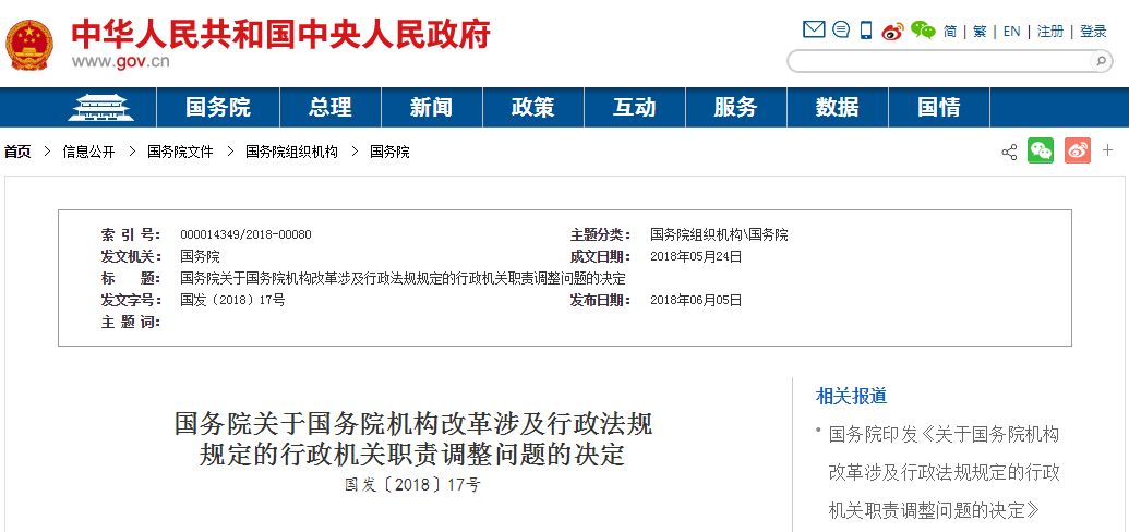 国务院印发《关于国务院机构改革涉及行政法规规定的行政机关职责调整问题的决定》,就国务院机构改革涉及行政法规规定的行政机关职责调整问题予以明确。