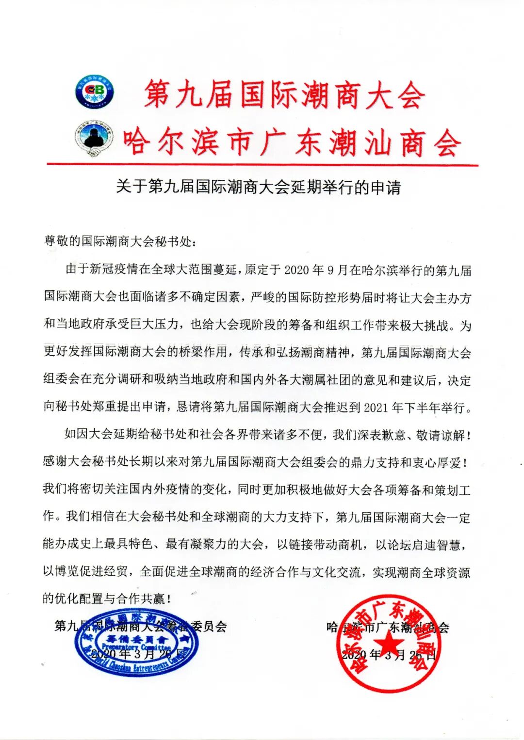 提示:点击上方"潮商"关注我们 ![]() ![]() ![]() 原定于2020年9月召开第九届国际潮商大会 因疫情原因 现延期至2021年下半年举行 ![]() 2004年5月,由海内外20个潮人商会和潮人联谊会共同发起召开潮商大会的倡议,同时商定首届大会在汕头市召开,此后,潮商大会秉承“交流、合作、服务、发展”的宗旨,开启每两年一届,先后由汕头、南京、北京、上海、深圳、珠海、南宁、海南等城市潮汕商会举办的壮丽征程。 随着大会规模发展的不断壮大和影响力的扩大, 2018年,在由海南省潮汕商会主办的第八届国际潮商大会上,潮商大会正式更为国际潮商大会,自此,奠定国际潮商大会的全球性视野及民间组织商贸盛会的国际地位。 2018年10月16日,潮商大会常务委员会会议在桂林灌阳县千家洞召开,会议讨论确定由哈尔滨市广东潮汕商会承办第九届国际潮商大会。 ![]() 因疫情原因,原定于2020年9月召开的第九届国际潮商大会现延期至2021年下半年举行。 来源:汕头市总商会 声明:本文不代表我们的观点,仅供读者参考。文章版权归原作者所有,如有侵权,请联系我们进行删除。 潮 商 文化的境界 · 财富的智慧