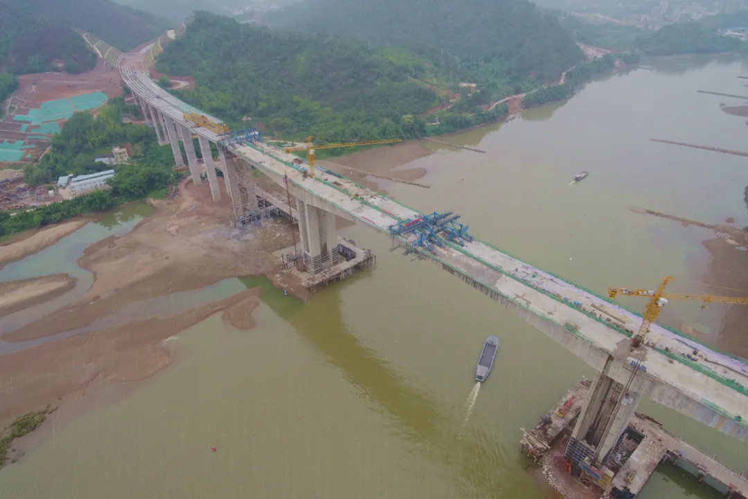 韩江特大桥位于梅州市大埔县大麻镇,是大潮高速项目单跨跨径最大的桥梁,也是项目控制性工程之一,对项目年底建成通车具有十分重要意义。大桥采用分离式断面设计,左幅桥长908米,右幅桥长868米,其中主桥采用100+180+100m三跨预应力混凝土连续刚构桥,引桥为跨径40米先简支后连续装配式预应力混凝土T型梁。大桥共计6个合龙段,此前已完成了2个边跨合龙,后续将会进行主桥左幅的合龙施工,预计月底合龙完毕。