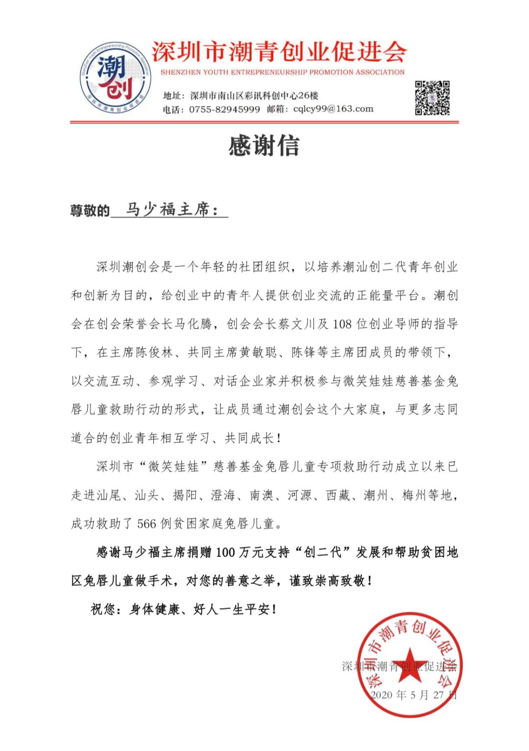 2020年5月26日,深圳市政协常委、新阶联主席、深圳置富集团董事局主席马少福莅临深圳潮创会参观指导工作,捐款100万支持“创二代”发展和微笑基金并祝贺深圳潮创会乔迁新会址大吉大利。