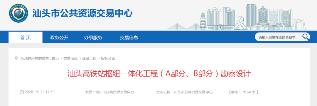 提示:点击上方"潮商"关注我们 近日,汕头市公共资源交易中心发布公告,汕头高铁站枢纽一体化工程(A部分、B部分)勘察设计正在进行公开招标。