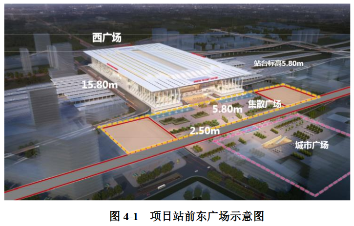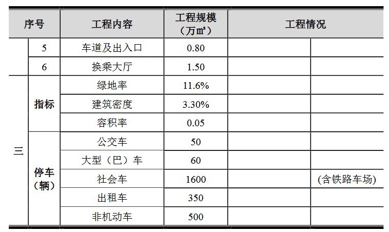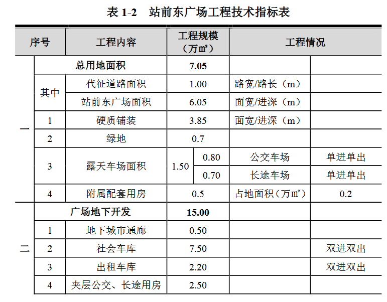 具体包括以下几个方面: (1)站前东广场工程站前东广场工程总用地面积约7.05万平方米,其中代征道路面积约1万平方米,站前东广场面积约6.05万平方米。 站前东广场地上工程包括硬质铺装约3.85万平方米,绿地约0.7万平方米,露天车场约1.5万平方米及附属配套用房约0.5万平方米。 站前东广场地下空间约15万平方米,包含地下城市通廊约0.5万平方米,社会车库约7.5万平方米,出租车库约2.2万平方米,夹层公交、长途用房约2.5万平方米,车道及出入口约0.8万平方米,换乘大厅约1.5万平方米。