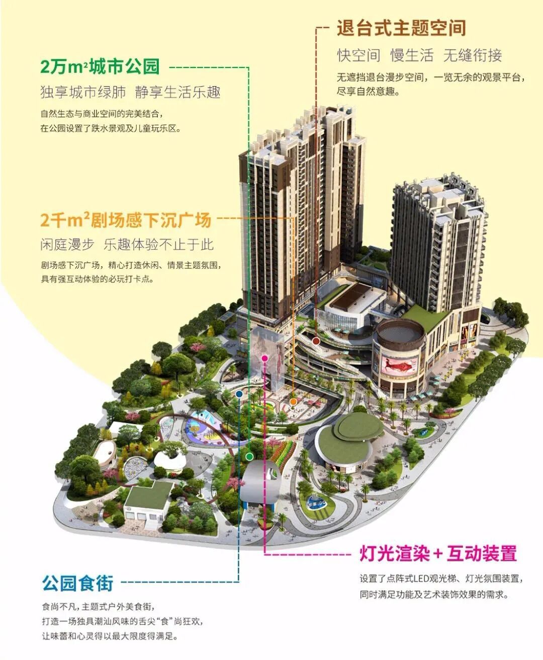 效果图 宜华万乐汇 粤东首个乐园式主题+汕头亲子游乐新地标,万乐汇坐落于新津河片区核心中轴,位处澄海、外砂镇入汕的门户位置,距离汕头高铁站约15分钟车程,定位为粤东全龄乐园式主题商业旗舰,类型涵盖亲子游乐、主题餐饮、健康休闲、游戏娱乐等多元系统。 效果图 揭阳 近几年,揭阳商业发展势头迅猛,万达、中骏、绿地、保利等知名开发商的入驻,购物中心、综合体遍地开花,城市商业业态换挡升级的步伐不断加速。 揭阳万达广场 揭阳万达广场项目位于揭阳榕城区,为揭阳汇金中心的子项目,汇金广场项目占地面积20.67万平方米,总建筑面积88.6万平方米。涵盖万达广场、万豪国际酒店、演艺会议中心、高端住宅、5A写字楼、SOHO公寓、人才公寓、养老公寓等多种业态。项目对标上海浦东陆家嘴,高起点谋划、高标准打造,是粤东业态最全、品质最高、面积最大的新一代城市地标综合体。