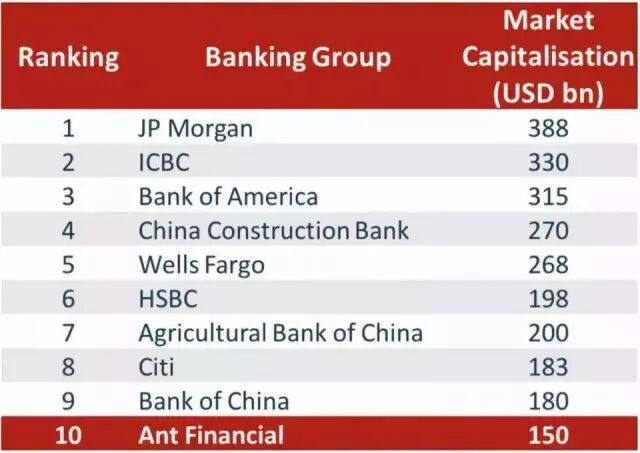 从估值看,蚂蚁金服体量跻身全球十大银行: