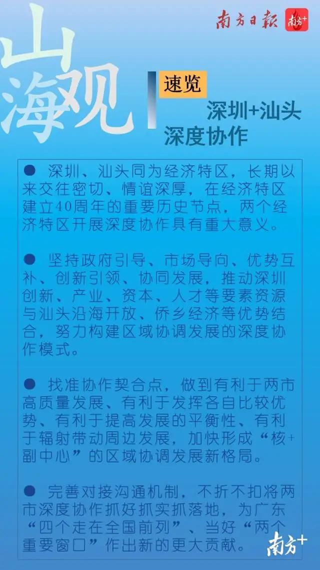 在经济特区建立40周年之际,深圳和汕头,这两个同属“第一批”的经济特区,因一个词刷屏朋友圈——深度协作。 7月29日,深圳市党政代表团到汕头学习考察,主题是:深入学习贯彻习近平总书记视察广东重要讲话精神,落实省委“一核一带一区”区域发展战略,推动两市深度协作落地落实。本次考察由深圳市委主要领导率队。规格之高,特殊之处,引发广泛关注。 深圳为何而来?从主题来看,简而言之,即为“两地深度协作”。 此行,深圳市党政代表团只用了一天时间,信息量却非常大。代表团一共去了四个地方: ——汕头港广澳港区,察看码头建设进展,详细了解汕头交通规划及深圳—汕头交通基础设施互联互通情况; ——上海电气风电广东有限公司,深入海上风电智能制造生产线,了解复工复产情况; ——礐石大桥南岸公园项目现场,听取汕头内海湾环境提升工程规划和进展情况; ——华侨经济文化合作试验区,考察位于试验区核心区的亚青会主场馆项目建设,听取试验区规划建设情况介绍。 汕头港广澳港区。资料图片 关键的信息,在两市召开的深度协作座谈会上。 深圳和汕头同为经济特区,但不可否认的是,经过40年的改革发展,汕头与“老大哥”深圳的发展差距不小,合作潜力巨大。 发生在两个经济特区之间的深度协作,注定与众不同。 华侨经济文化合作试验区。杨立轩 摄 从会上阐述的深度协作的定位来看,两市将坚持政府引导、市场导向、优势互补、创新引领、协同发展,推动深圳创新、产业、资本、人才等要素资源与汕头沿海开放、侨乡经济等优势结合,努力构建区域协调发展的深度协作模式。 此番两市释放利好,不仅仅是双赢,还将营造多赢的局面。深度协作的“利好”包括:有利于两市高质量发展、有利于发挥各自比较优势、有利于提高发展的平衡性、有利于辐射带动周边发展。 两市的深度协作,更具开创性的是,将加快形成“核+副中心”的区域协调发展新格局。这样的区域协作模式,不管对于深圳,还是对于汕头,都将是一次全新的探索和实践。 深圳以及深汕两地深度协作,对汕头意味着什么? 深圳作为改革开放的先行者、经济特区的排头兵,40年来经济社会发展取得令人瞩目的成就,是汕头学习的榜样和范本。深圳独具的创新、产业、资本、人才等要素资源优势,同时也是汕头的短板与不足所在。与深圳的深度协作,将为汕头擦亮特区招牌、焕发特区活力带来新机遇、注入新动能。 汕头海上风电智能制造生产车间。资料图片 这次,深圳为何主动推动深汕两地深度协作? 从两地深度协作座谈会释放的信号来看,无外乎两点。 一个是身处经济特区建立40周年的重要历史节点,两个经济特区开展深度协作,具有深远而重大的现实意义。 另一个是粤港澳大湾区和深圳先行示范区“双区”建设,对深圳、汕头来说,都是一次千载难逢的历史机遇。肩负“双区”建设历史使命的深圳,“引领带动全省改革发展各项工作开创新局面”,成为其履行使命的题中应有之意。在新时期,深圳和汕头都必须以扎实工作为广东在形成全面开放新格局上走在全国前列,作出经济特区应有的贡献。 2018年6月,广东省委十二届四次全会提出:以构建“一核一带一区”区域发展格局为重点,加快推动区域协调发展。强化广州、深圳“双核”驱动作用以及加强汕头、湛江两个省域副中心城市建设,成为这一战略部署的重中之重。 在全新的区域发展布局中,建立“双核+双副中心”动力机制,被寄予厚望。 可以预见,深汕两地“核+副中心”的深度协作,对于广东促进区域协调发展,将具有示范作用。 汕头海湾大桥。资料图片 中国(深圳)综合开发研究院副院长曲建指出,经过40年经济特区建设,深圳和汕头的改革发展都取得巨大成就。从GDP总量来看,汕头与深圳相比有较大的差距,但评价一个地区的发展,GDP总量不是唯一的标准。众所周知,汕头是著名侨乡,改革开放进程中,华人华侨在汕头发展中起了重要作用,也推动了汕头的发展。 曲建认为,在国际形势日趋错综复杂的情况下,我们需要进一步发挥华人华侨连接中国与世界、推动改革开放等作用。深圳跟汕头联合起来,如果能够在华侨经济文化合作方面探索出新的模式,为华人华侨发展创造新的环境,将产生深远的影响。深圳和汕头都有国家级平台,前海和华侨经济文化试验区,这两个优势叠加在一起,通过制度创新、政策创新等,进一步发挥好华侨华人资源优势,这是一股很重要的力量。 深圳的发展速度令人瞩目。 广东省委党校原副校长、教授陈鸿宇对此评价,深圳和汕头两个特区开启深度协作的新模式,是经济特区40年再出发的重要行动。特别是这次深圳市委主要领导主动到汕头考察,深入了解汕头发展情况、对接发展需求,推动深圳与汕头深度协作,备受外界关注。 陈鸿宇表示,深圳在建设中国特色社会主义先行示范区,又是大湾区的核心引擎,汕头被定位为省域副中心城市。“核+副中心”的深度协作,被看作落实省委“一核一带一区”区域发展新格局,谋划经济特区再出发的重要一步。 “这次深圳市党政代表团的考察行程也非常有指向性。”陈鸿宇指出,走访的都是汕头的重大平台和重大项目,这些将为深汕两地深度协作提供重要载体。相信在省委的部署以及两地的努力下,深圳和汕头将在落实“双核+双副中心”、把沿海经济带作