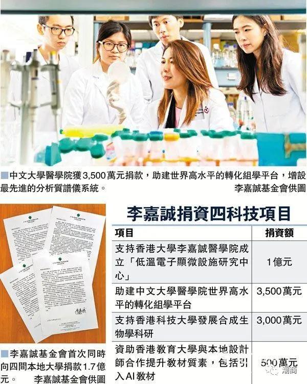 9月16日,李嘉诚基金会捐款1.7亿港元予香港四大高校,支持多个科技项目,帮助香港提升实质竞争力。 同时,李嘉诚致函香港大学李嘉诚医学院、香港中文大学医学院、香港科技大学、香港教育大学,引苏东坡《赤壁赋》,鼓励在万物多变中,以创新力量求存立足未来,以推动教育冲出混沌迷惘。 这四个项目分别为, 1亿港元支持港大李嘉诚医学院成立“低温电子显微设施研究中心”;3500万港元助建中文大学医学院世界高水平的转化组学平台;3000万港元支持科技大学发展合成生物学科研;500万港元资助教育大学与本地设计师合作,引入全港首个终端AI教材。 此外,基金会表示,已向每名港大李嘉诚医学院应届毕业生发放5万港元奖励金,同时李嘉诚向毕业生赠言:“凭仁善断是艺术,是你给每一正与疾患对阵、力争康复的病者良方。“ 这是李嘉诚基金会首次同时向香港四大高校捐款,李嘉诚强调,香港医护、科研、教育人才均甚具潜质,加上“凭仁善断”的素养,定可继续以专业服务香港。 他表示,生物医学科技已成为解决各种生命难题的神幻钥匙,AI“无码”应用将是全方位能力提升的关键,面广寸深的大类课程已不足支撑长远竞争力,发展生物经济产业、推动AI能力在香港普及,刻不容缓。 李嘉诚基金会于1980年创立,主要专注于支持教育及医疗项目,至今已捐出总款逾270亿港元,项目遍及全球27个国家及地区,其中约80%项目在大中华地区。 李嘉诚曾多次形容基金会是他“第三个儿子”,专注于支持教育及医疗项目。据悉,李嘉诚将个人财富的三分之一投放在李嘉诚基金会,并在 2018年退任长和主席后专注基金会工作。 来源:21世纪经济报道、新浪财经 声明:本文不代表我们的观点,仅供读者参考。文章版权归原作者所有,如有侵权,请联系我们进行删除。 |