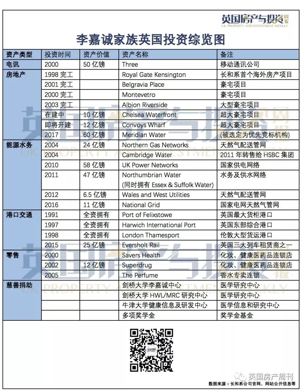 5 Broadgate大厦高13层,四个交易大厅总计67,000平方米空间,相当于四个足球场。目前,大厦内部有超过3000名UBS员工外加2400名管理及支持员工。 此前阿布扎比主权财富基金Mubadala Investment Company曾与BL及新加坡主权财富基金GIC磋商购买5 Broadgate,之后又考虑购买大厦40%的股份,但最终没能成交。 2013年,新加坡主权基金买下大型写字楼和商业混合开发项目Broadgate项目一半股份,该项目位于伦敦金融城核心地段,是金融危机之后最大的欧洲地产交易。 李氏家族的伦敦帝国 说李嘉诚家族买下半个英国,并非过度夸张,他麾下的英国资产,包括英国最大的货柜码头、英国最大的供电网络、英国最大的列车租赁商之一、英国最大的移动通讯商之一、英国最大水务企业之一、英国最大化妆品健康保健医药零售企业之一,以及在伦敦拥有两个超大型房地产开发项目等。 李氏家族还在英国剑桥大学、牛津大学大笔捐助,建设了三个大型的医疗研发中心。 李氏家族在英国的详细资产名录如下: