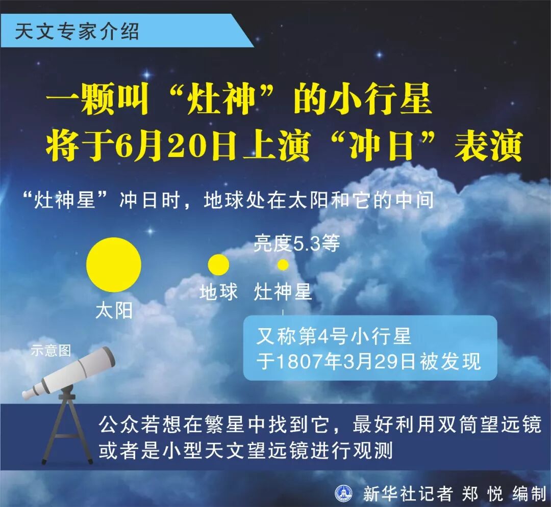 天文专家介绍,一颗被称为“灶神”的小行星将于6月20日上演“冲日”表演。届时,我国感兴趣的公众可借助望远镜对其进行观测。