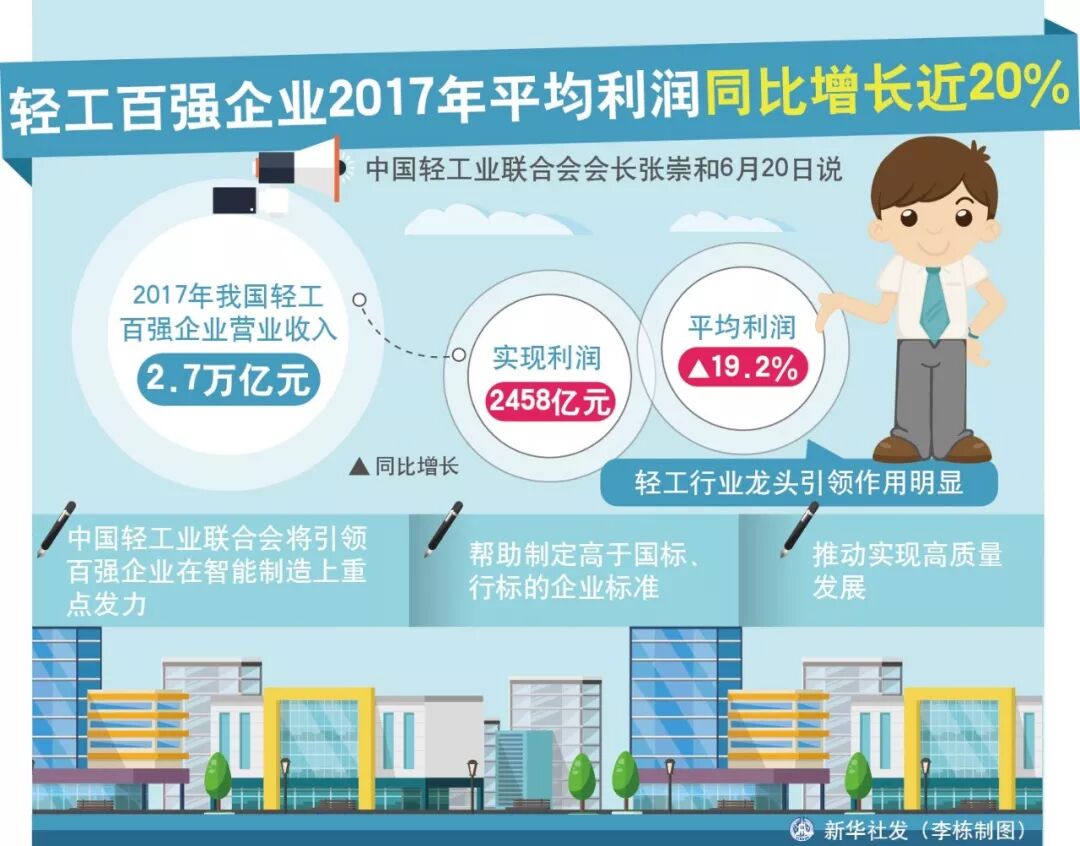 2017年我国轻工百强企业营业收入2.7万亿元,实现利润2458亿元,平均利润同比增长19.2%。