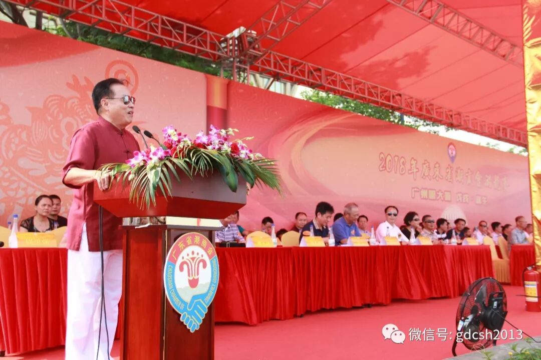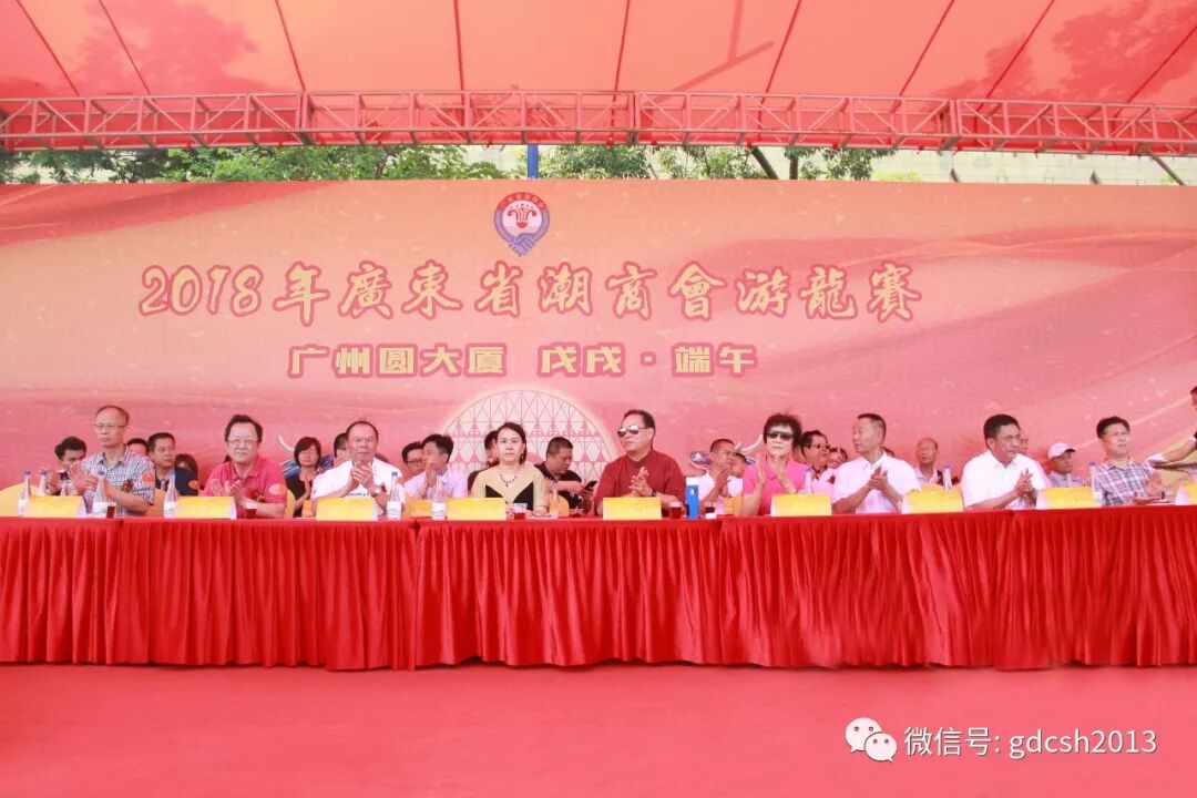 主席台 6月18日下午,2018年广东省潮商会游龙赛在广州圆大厦前珠江沿段隆重举行,出席活动的嘉宾有:广东省委原副书记蔡东士及夫人芮琳女士,广州军区原副政委张汝成中将,广东省人大常委会原副主任黄伟鸿,省社管局李志华处长、广东省潮商会高级顾问罗林竹,广东省潮商会名誉会长周修侠,广东省潮人海外联谊会监事长林万洲、副会长刘育民、姚木成,泰国华人青年商会常务副会长林兆祥,出席游龙赛的还有鸿达兴业集团总经理郑楚英女士,广东省潮商会常务副会长林喜七、范思斌、陈镇雄、周昭庭、张钦加、郭子龙、郑永远,秘书长周勇强以及商会的副会长、常务理事、理事、会员、潮青等嘉宾朋友们1500多人。