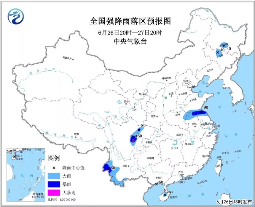 26日夜间至27日,四川盆地西部以及黄淮南部、江淮、云南西部和南部等地的部分地区有大到暴雨、局地大暴雨,并伴有短时强降水和雷暴大风等强对流天气。