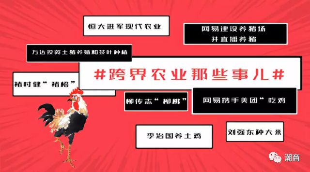 提示:点击上方"潮商"关注我们 最近,世界杂交水稻之父袁隆平带领团队屡创佳绩,先是在迪拜沙漠中种出杂交稻,让热带沙漠惊现“人造绿洲”,再是培育出“抗癌”水稻新品种,再一次向世界展示了农业领域的“中国力量”! 近年来国家一直倡导三产融合和跨界融合,农业也被诸多专家和行业大佬们认为是最适合跨界的行业。这不,6月15日,碧桂园正式宣布进军现代农业,并将与袁隆平及开研资本有限公司合作,共同推动第三代杂交水稻的研究和推广。 发布会上播放了袁隆平录制的视频。袁隆平说,很高兴碧桂园农业控股有限公司投资第三代杂交水稻的研究和发展,这个很了不起,这么一个大企业的参与将对第三代杂交水稻的发展起到关键性的推动作用。他还透露,将尽快在广州挂牌成立第三代杂交水稻研究中心。 碧桂园集团主席杨国强说,“40年前我种田,40年后我还是回去种田”。房地产业务蒸蒸日上,进军现代农业成了碧桂园新的出发点。 未来,碧桂园农业将引入世界一流的农业生产技术、设备,采用“公司+农户”发展模式,建设农业博览园,进军先进农机业和种业,打造农产品质量安全体系。 碧桂园 2016 年就对农业进行了尝试 其实,除了杨国强之外,近年来众多商界大佬都开始“不务正业”玩起了“跨界农业”,其中不乏李嘉诚、马化腾等潮商。这份跨界农业的商界大佬名单很长,请一起来看看—— 丁磊养猪 2009年,网易CEO丁磊高调宣布跨界养殖行业,投资千万建设养猪场并计划将养猪的全过程放在网站直播。而后,在“大吉大利,今晚吃鸡”的全民“吃鸡”热潮中,网易再接再厉,携手美团CEO王兴创立品牌“长汀河田飞鸡”,并于今年5月7日正式登陆京东和网易考拉平台。 柳传志卖桃 “佳沃”是联想控股的现代农业品牌,于2013年5月正式推出 2012年,85岁的中国烟草大王褚时健种植的“褚橙”通过电商开始售卖,“褚橙”大火后,企业家也跟风刮起了为水果代言的流行风,地产大佬潘石屹为其家乡甘肃天水的苹果代言——“潘苹果”,以联想之父柳传志的姓氏命名的“柳桃”也开设了旗舰店。 刘强东种大米 “不知妻美”的的刘强东娶了奶茶后可谓是走上了人生巅峰。2012年,刘强东在微博宣布要回江苏宿迁老家种大米。他租了5000亩土地,不施农药、化肥,第一批大米当年6月在京东商城叫卖。每斤售价6元到25元不等,远高于市场价格。 目前,京东的务农地图已经越铺越大,京东农场、京东农服APP、京东农业研究院等纷纷上线。 马云养牛 2014年,由阿里巴巴董事局主席马云联合发起的云锋基金以及中信产业投资基金斥资20亿参与投资伊利子公司畜牧公司开养奶牛 。 此外,阿里推出了ET农业大脑,希望将人工智能与农业深入结合,还和西安扶贫办及特大型农业企业启动了智慧农业合作。 马化腾建鹅厂(?) 今年4月1日,腾讯一大早宣布其筹划的“养鹅厂”已正式在贵州贵安新区落地,主要养殖平坝灰鹅,未来技术成熟后会考虑养殖企鹅或者天鹅。 “鹅脸识别”记录鹅的各项健康指标,“鹅语翻译”对上千万条鹅类语料库进行训练,“腾讯觅影”对鹅类疾病进行筛查和诊断......最后,腾讯养鹅项目的负责人竟表示,这只是愚人节的一个玩笑啦(鹅厂城会玩!)不过该负责人强调,腾讯确实一直在致力于推动人工智能结合农业的新互联网+模式,腾讯赞助的人工智能温室种植大赛已经向全行业内顶尖的专家发出了邀请函,此外,腾讯在贵州筹建中国首个山洞数据中心也是真的,一旦该数据中心落地,将会有更多的用户享受到更加绿色、稳定、便捷的数据服务。 李嘉诚的农业版图 李超人退休了,但他庞大的商业帝国还在继续运作着。涉足农业领域并非李嘉诚退休后“归隐田居”的新爱好,实际上他谋划农业版图已经20年,更在全球都拥有种植园! 2016年,隶属于李嘉诚旗下的CKlifeSciences公司获得了澳大利亚外国投资审查委员会(FIRB)的批准,成功收购西澳7000公顷的谷物种植场,整个资产包括了五块土地和一个谷仓,是迄今为止西澳最大的一桩土地所有权交易。 收购葡萄园、投资高科技植物鸡蛋和“人造肉”、布局“中药农业”......超人的跨界农业玩得不要太溜! 大佬纷纷进军农业为哪般? 1.食品安全问题成为大佬进军农业的催化剂 随着经济水平的不断发展,消费观念的不断进步以及近年来防不胜防的食品安全问题,直接促进了消费者对绿色生态农产品的旺盛需求,为了吃到安全食品,有相当大一部分人愿意为品牌付出溢价。 而这也成为促进产业大佬们进军农业的直接因素。丁磊、刘强东进军农业,一个直接因素就是想探索出全新的农业模式,规避令人担忧的食品安全问题,让消费者吃上放心的猪肉、大米、水果、蔬菜。其实我们看到,几乎所有的大佬进军农业,打出的都是一副绿色安全健康牌。 2.民以食为天,中国农业现实蕴含巨大机会 无利不起早,商业大佬们跨界进军农业,并非一时的心血来潮,个人认为最根本的一点还是看中了中国农业发展所蕴含的巨大机会。有意将其打造为企业新的业务赢利点。 首先国家政策正在大力推进农业现代化建设,近年来,国家对农业的投入一直在加大力度,农业投入额度不断增长,数据显示:中央三农投入从2005年的2975亿增加到2013年的13799亿,复合增速达到21%。而另一方面则是:当下中国农业正处于从近代化农业朝着现代农业全面演进阶段。农业发展正砸