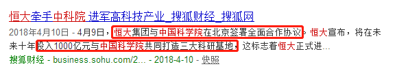事实上,虽然贾跃亭的信用已经破产,但FF的技术确实得到不少认可。FF在中美两地提交申请专利接近1500件,获得专利超过380件。 据侦探君了解,恒大要进行业务多元化、布局高科技产业的心思也早已有据可循。今年4月,恒大与中国科学院在北京签署全面合作协议,并宣布将为这次合作投入1000亿元,正式进军高科技产业。