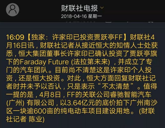 据澎湃新闻报道,FF陷入财务困境时,曾同时接触过恒大、时颖公司。但在恒大对FF进行尽职调查评估时,时颖公司率先与FF签订交易协议。恒大评估完毕后,才决定向时颖公司溢价发起收购。 谣言,遥遥领先的预言 资本市场最擅长把谣言变成遥遥领先的预言。 自从今年2月14日,贾跃亭宣布FF已经完成15亿美元股权融资后,关于投资人是谁的传言就从未间断,而其中“呼声”最高的就是恒大和许家印。 在今年3月份的恒大2017年全年业绩发布会上,有记者提问是否会投资贾跃亭,许家印并未正面回答。 4月8日,FF关联公司睿驰汽车拍得广州600多亩建设用地当天,再次有消息称,恒大许家印或已投资贾跃亭的FF。 4月16日,财联社发布消息,“许家印已投资贾跃亭FF”,已经没了“可能”、“或已”等不确定词汇。