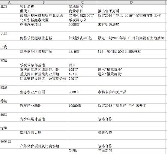 其实坊间普遍猜测恒大醉翁之意在地不在车。 乐视风光之时,也曾是各地方政府的座上宾。在各地低价甚至直接拿地建设“生态城”也成为乐视一大笔开销。据界面新闻的不完全统计,截止2017年6月,乐视已在全国超过10个城市拿下了超25000亩土地,但随着资金链断裂,大部分项目陷入停滞。